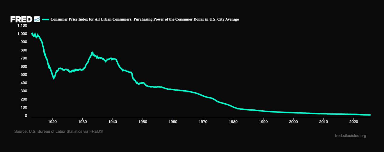 Above: US Government data tracking the CPI or Consumer Price Index across the history of the US Dollar. It shows that, over time, the purchasing power of one dollar has eroded significantly and continues to do so. This is because inflation is a feature of fiat currency, including the US Dollar. In other words, your money loses value over time — on purpose.