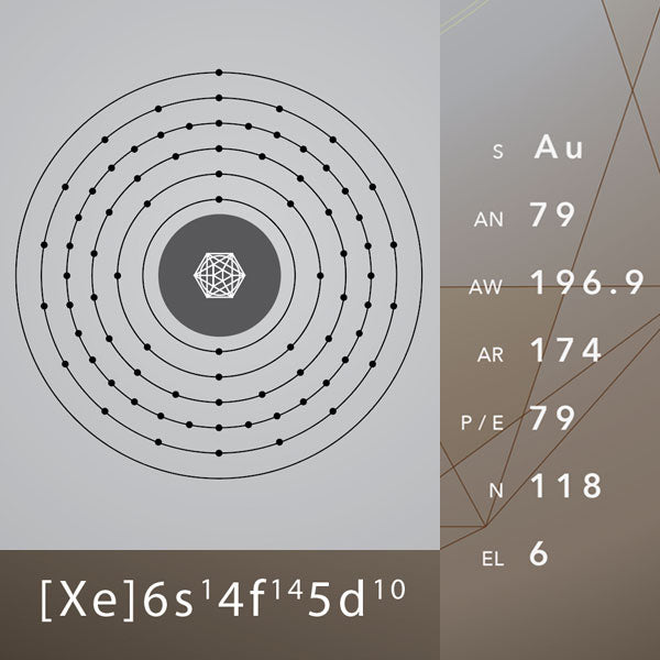 Taken from the periodic table, the atomic properties of gold are visually represented, including the symbol, atomic number, radius, electrons, neutrons, and more.