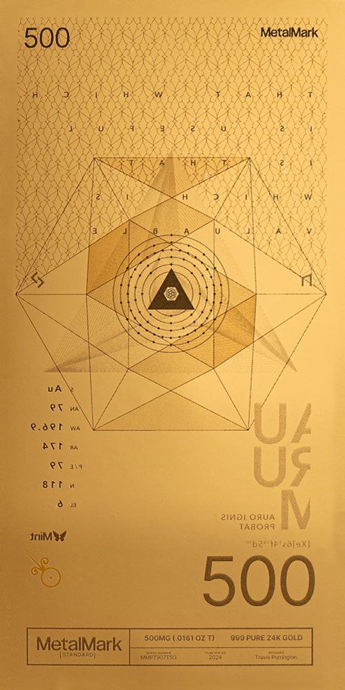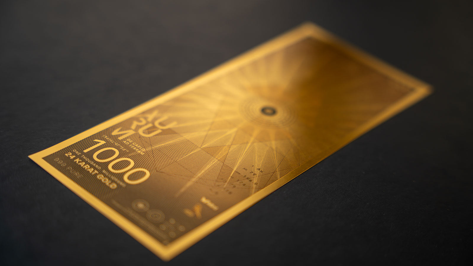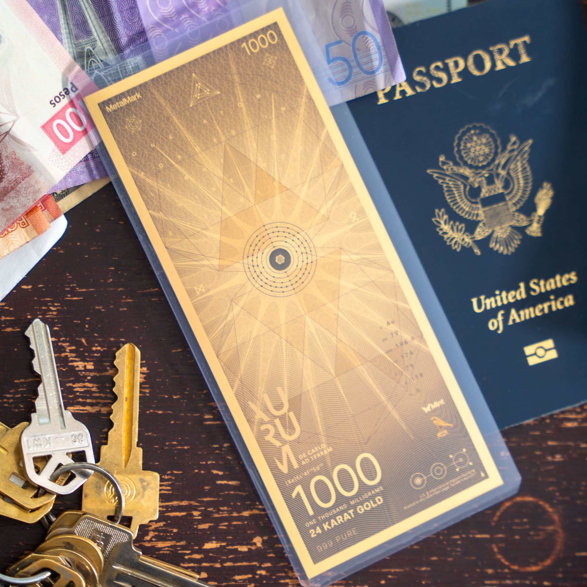 Official Aurum® fractional gold bills: Flexible, durable, double-sided 24-karat gold bills. Great for collecting, stacking, and barter. Available in 500mg and 1000mg weights with more on the way.
